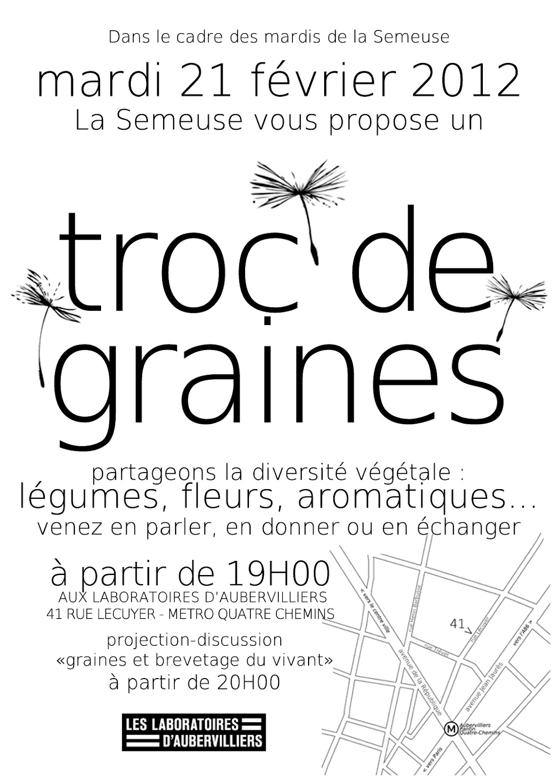 Dans le cadre des mardis de la Semeuse, Guilain Roussel et l’équipe des Laboratoires d’Aubervilliers organisent un troc de graines mardi 21 février. Venez à partir de 19h partager vos graines et assister à la projection-discussion qui suivra : »graines et brevetage du vivant ».
