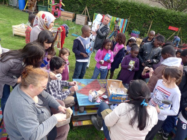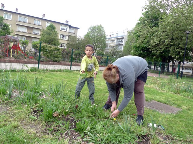 Enfin une belle journée pour investir le jardin! Les habitants étaient au rendez-vous, nous étions plus de 30, adultes et enfants pour ce « premier » jour printanier. L’équipe des espaces verts nous avaient gentiment tondu la pelouse(adieu nos prêles et roses trémières!), rendant l’espace plus agréable et praticable.