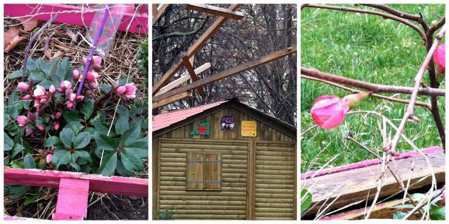 Le jardin s’éveille! L’héllébore et le cognassier du Japon sont en fleurs!