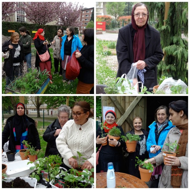 Vendredi 26 avril, nous avons reçu un groupe de femmes venant des quartiers Vallès-La Frette et du Landy, pour une présentation du jardin et une courte initiation au jardinage. La météo étant frisquette, une seule a osé venir pique-niquer avant la séance! Nous avons commencé par trier les graines récoltées l’automne dernier pour les conserver dans des pochettes papier. Puis nous leur avons fait faire un tour du jardin pour tenter de reconnaître les plantes. Pour terminer la séance, elles ont repiqué dans des pots individuels les plants achetés par le service Démocratie locale : menthe, persil, thym, poivrons et tomates cerise.