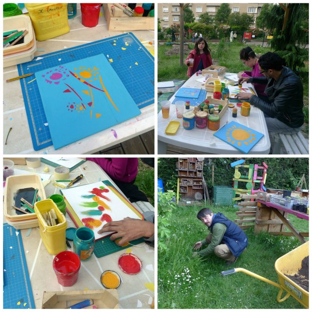 Les participants ont choisi chacun une plante du jardin qu’ils ont dessinée et transformée en pochoir. Ils ont ensuite peint les formes avec plusieurs couches de peinture sur des supports en bois que nous avons vissées sur le chalet.