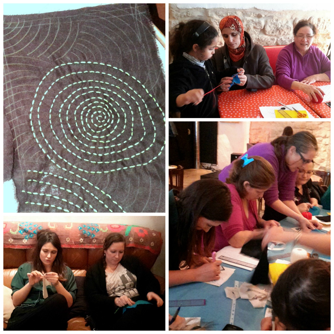 Le premier atelier a eu lieu au rez-de-chaussée du Grand Bouillon le 30 janvier 2015. A près leur avoir présenté le projet, nous leur avons montré la technique du sashiko , broderie japonaise destinée à l’origine au matelassage et au renforcement du tissu. Les motifs traditionnels sont géométriques , et passé le report des motifs sur tissu, c’est une technique qui procure de vrais moments de détente!