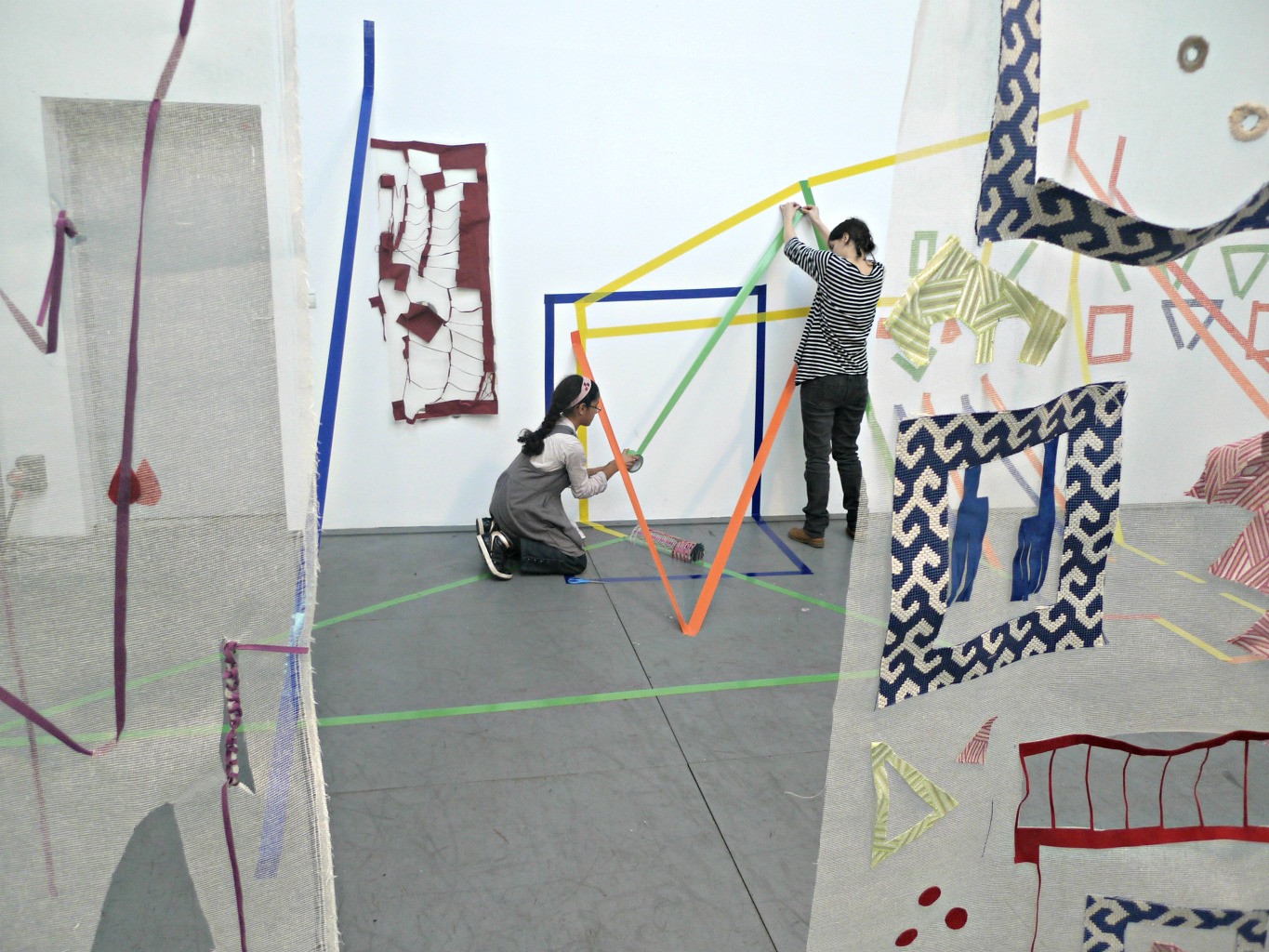 Nous explorons la potentialité des matériaux, nous expérimentons différents outils, différents médiums dans différentes situations (tissus, tarlatane, scotch…)