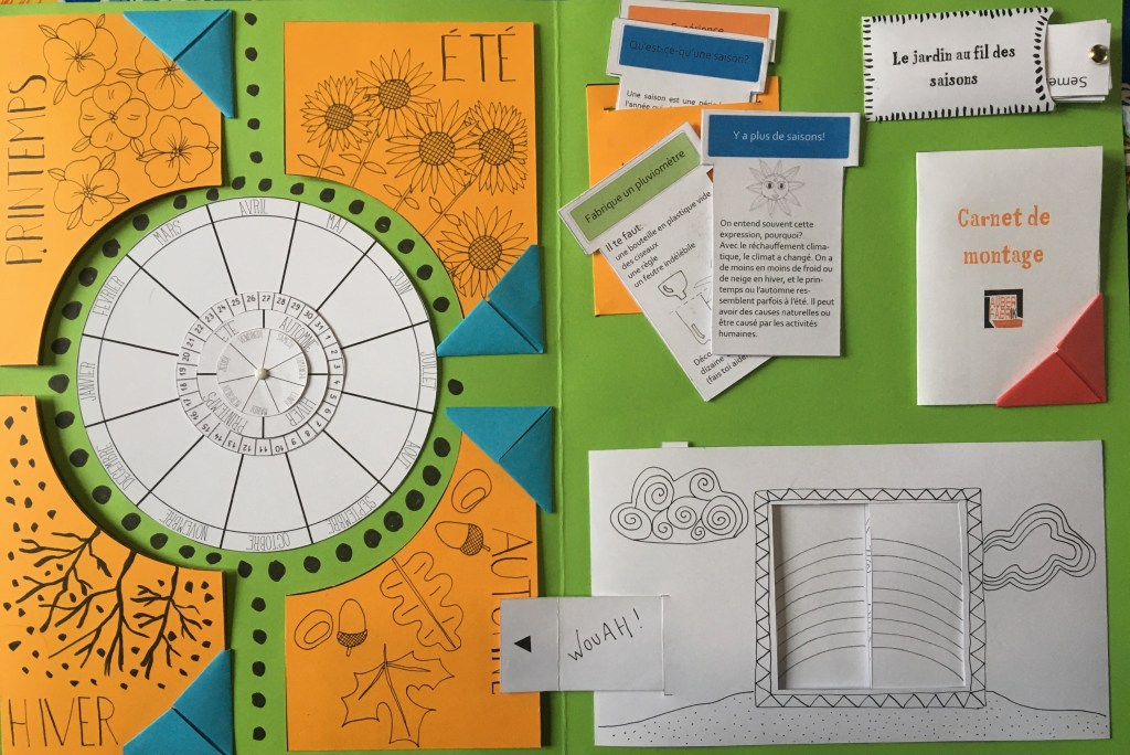 Le premier cahier d’activités en kit sur le thème des saisons a été expédié par la Poste aujourd’hui! Un cahier à construire et à décorer à la maison puisqu’on ne peut pas se retrouver au jardin. Dans ce premier d’une série de 6, l’enfant pourra fabriquer une roue des saisons, apprendra plusieurs techniques de pliages et construira une carte magique!Les fiches lui permettront de faire quelques activités en plus.
