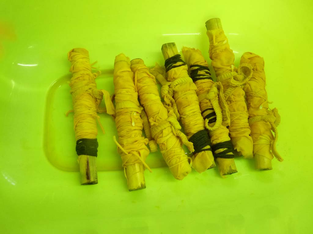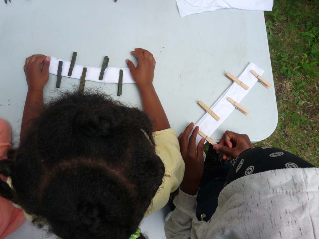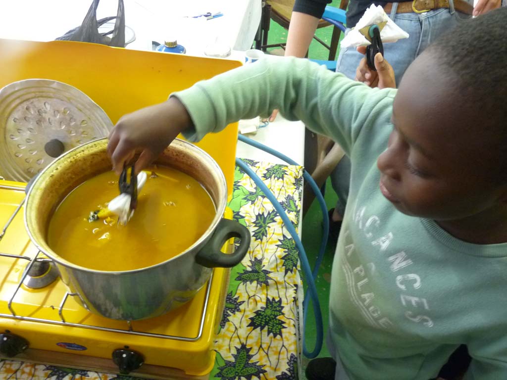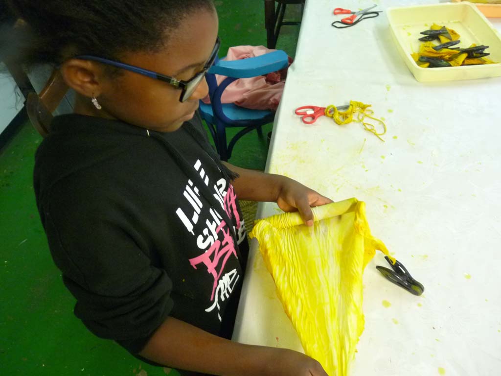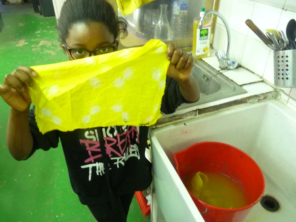Sylvie et Stella Napolitano ont donné suite le mercredi d’après avec un atelier de Shibori, une technique de teinture qui vient du Japon. Après réaliser des pliages et attaches diverses, les participants ont trempé ses tissus dans une préparation à base de curcuma. Quelques heures plus tard on a pu découvrir les différents motifs.