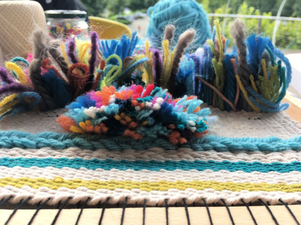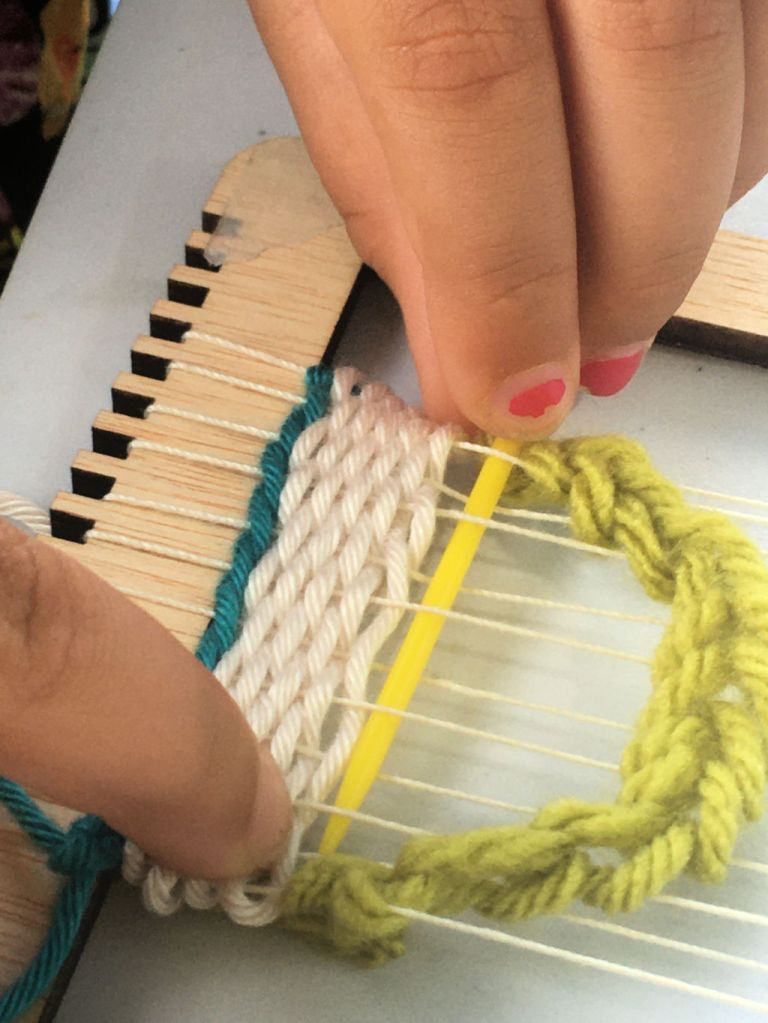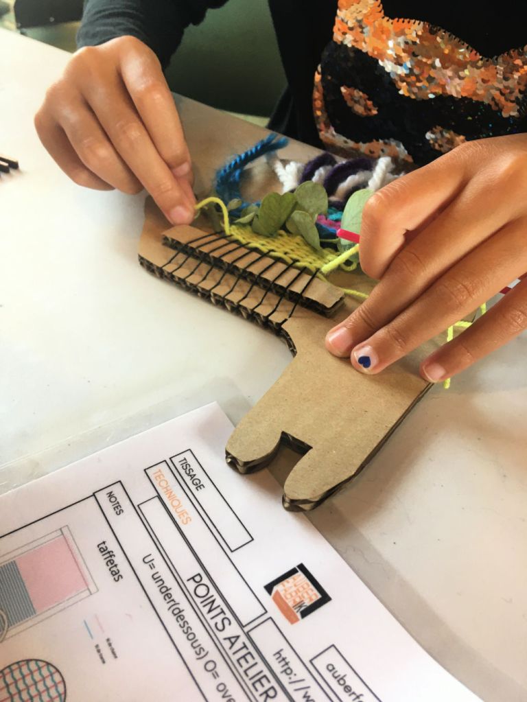 « Tisser les couleurs » a permis aux participants de découvrir quelques points comme le point taffetas, le point de Panama, le double Soumak et le noeud turc. Un joli voyage dans le monde du tissage qui a déclenché quelques nouvelles passions. Certaines familles sont revenues plusieurs fois, et ont pu ainsi passer à l’étape supérieure avec les formes géométriques ou la création de bracelets tissés.