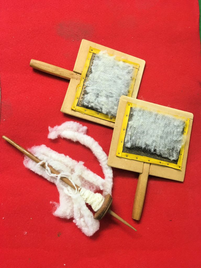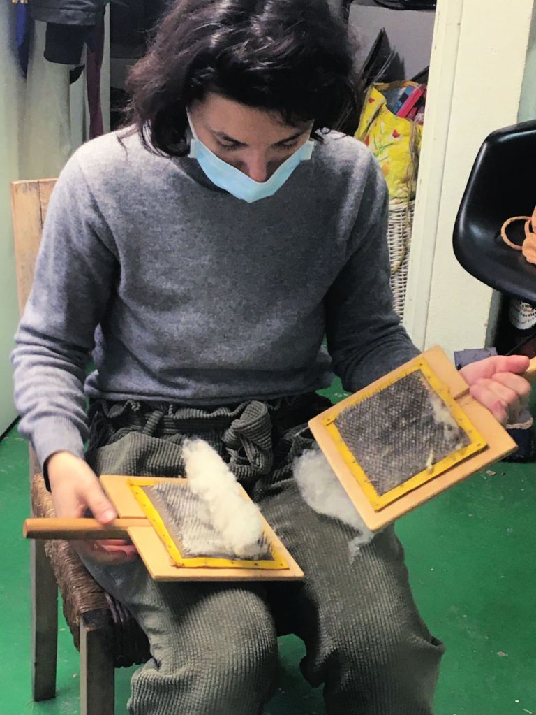 Pour le cardage de la laine, les peignes doivent être d’abord recouverts d’une couche de laine martelée avec une pierre. A défaut, nous avons cisaillé en touts petits morceaux un peu de toison et en avons tapissé nos peignes.