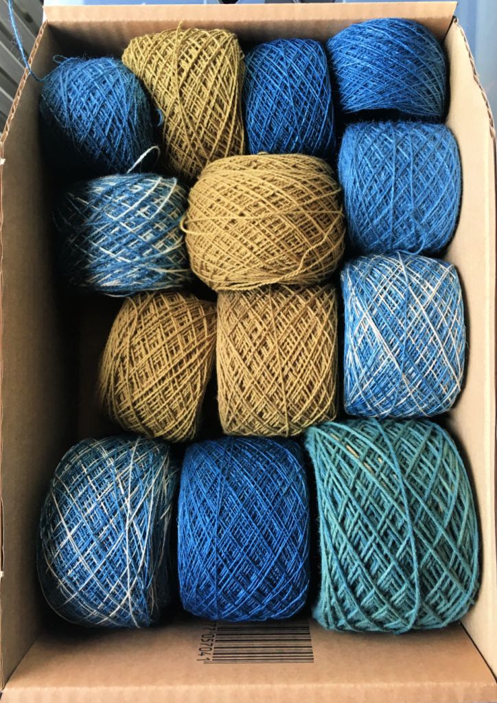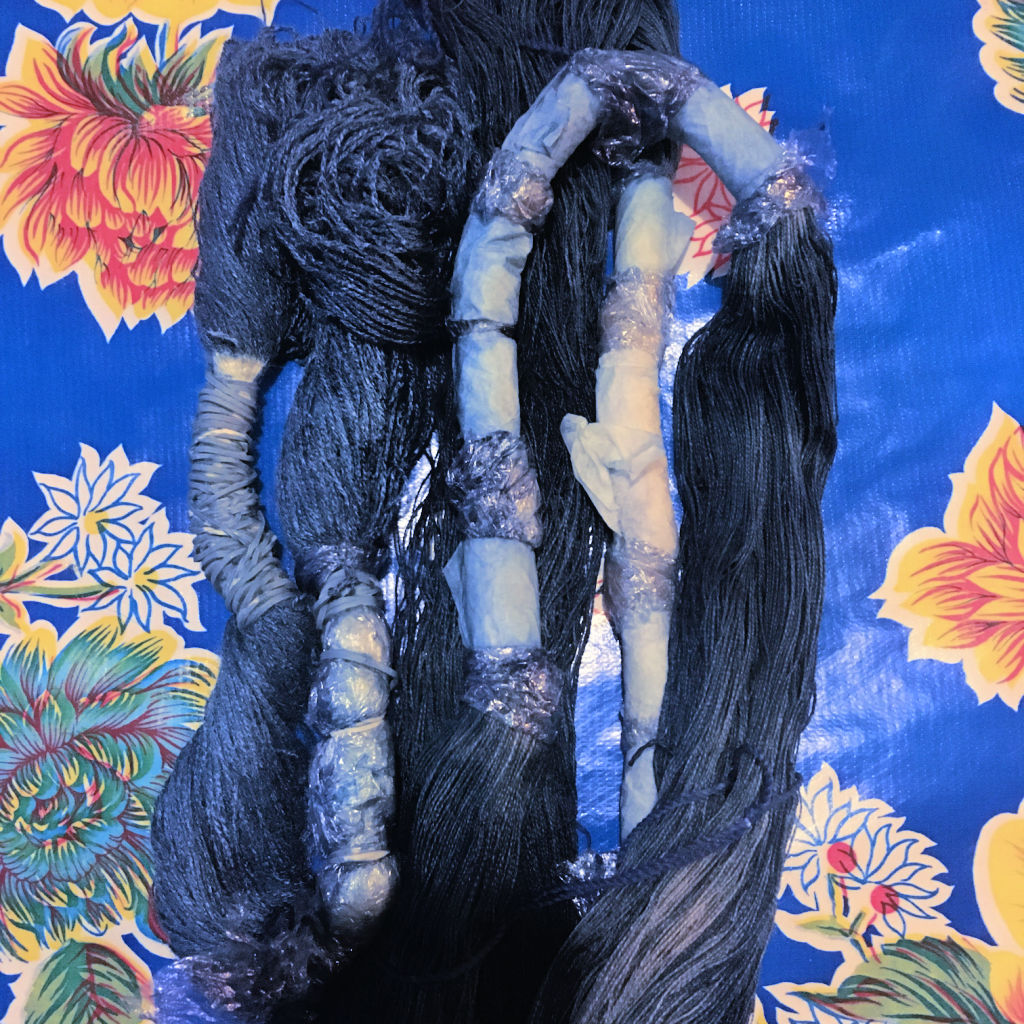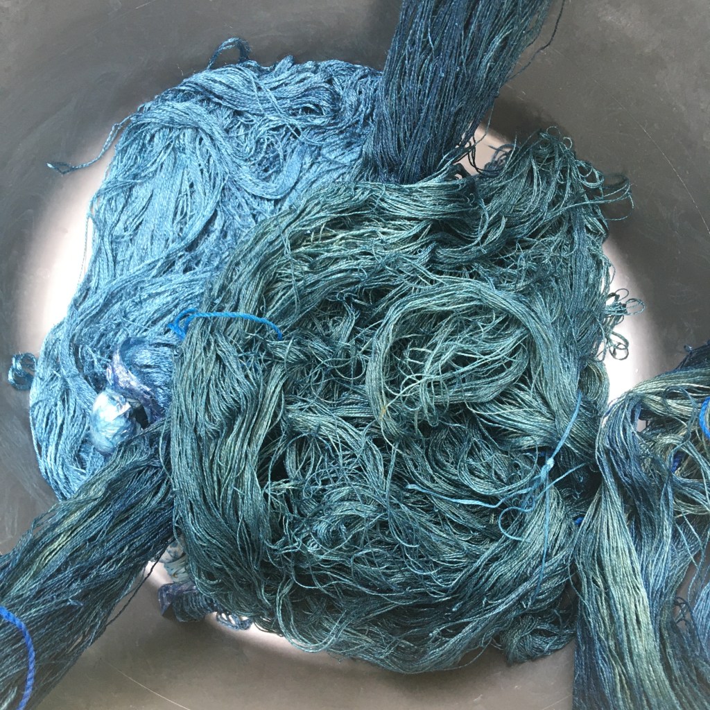 Nous avons également commencé les teintures végétales pour le Festival du lin. Les écheveaux proviennent de chez Fonty, et après les avoir mordancés, nous les avons teint avec de l’oignon jaune, de la garance, de l’oignon rouge(ce vert bronze!), du bois de campêche et de l’indigo.