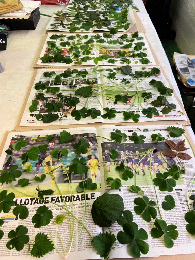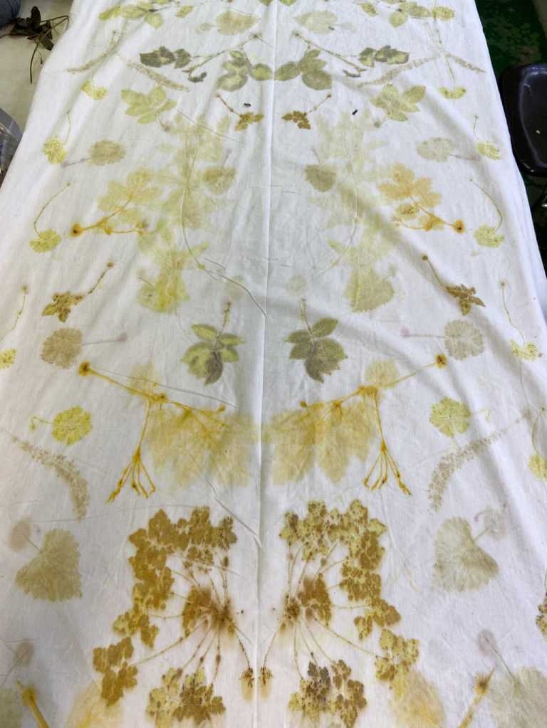 Mercredi 29 mars, nous avons imprimé le premier drap avec les plantes du Jardin des fabriques : achillée millefeuilles, rosiers, ronces, géranium Herbe à Robert, chélidoine…