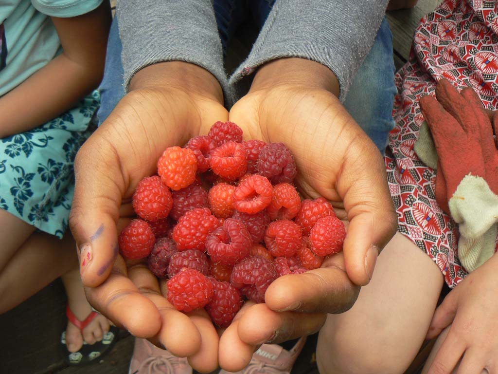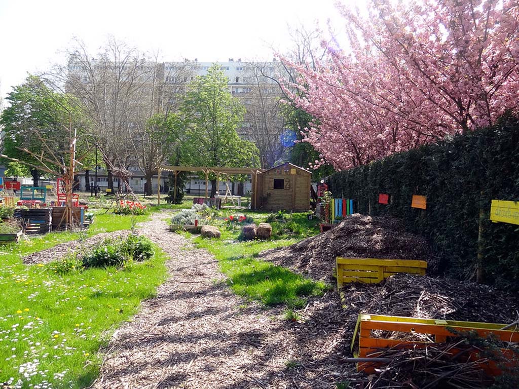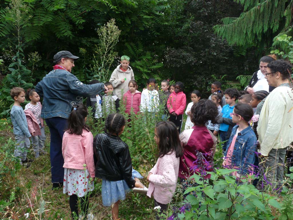 Au cours de ces 12 années, nous avons construit un riche patrimoine végétal, une oasis écologique au cœur de la cité Cochennec. Cet espace de préservation de la biodiversité en milieu urbain est devenu une vraie forêt comestible avec une quinzaine d’arbres et arbustes fruitiers : pommier, cerisier, figuiers, abricotier, sureaux, merisiers, noisetier, pruniers, mirabellier, vigne, framboisiers, fraisiers, groseillier blanc, groseillier à maquereau, ronces entre autres. On trouve également des dizaines d’espèces et de variétés d’arbres, d’arbustes et de grimpantes décoratives : eucalyptus, frêne, ailante, buddleia, céanothe, forsythia, arbre de Judée, chèvrefeuille, divers rosiers, passiflore, jasmins, lierre, vigne vierge, et des dizaines d’espèces de plantes médicinales, aromatiques, sauvages et cultivées : romarin, sauge, lavande, thym, menthe, mélisse, rudbeckia, orties, carotte sauvage, plantain, laitues, consoude, chélidoine, trèfles, luzerne, moutarde, armoise, mauve, pissenlit etc.. Tout cela a été possible grâce à l’aide des habitants de la cité Cochennec-Tillon-Jarry, notamment les enfants et jeunes, qui nous ont accompagné depuis toutes ces années, dans l’entretien et l’animation du jardin. Mais également les adultes qui ont été nombreux à nous soutenir et planter avec nous dès les débuts du jardin.