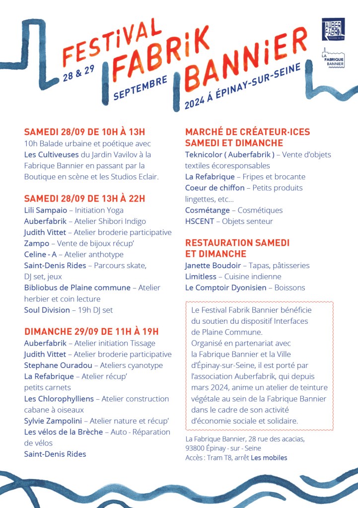 Organisé en partenariat avec la Fabrique Bannier et la Ville d’Épinay-sur-Seine, il est porté par l’association Auberfabrik, qui depuis mars 2024, anime un atelier de teinture végétale au sein de la Fabrique Bannier dans le cadre de son activité d’économie sociale et solidaire.