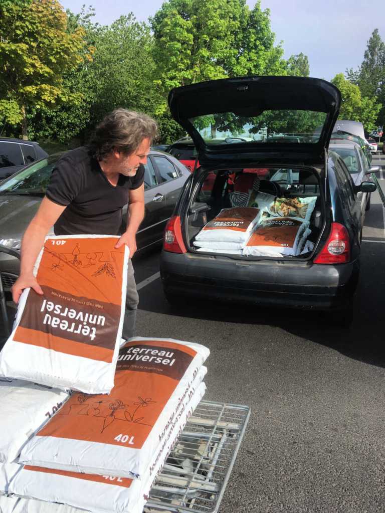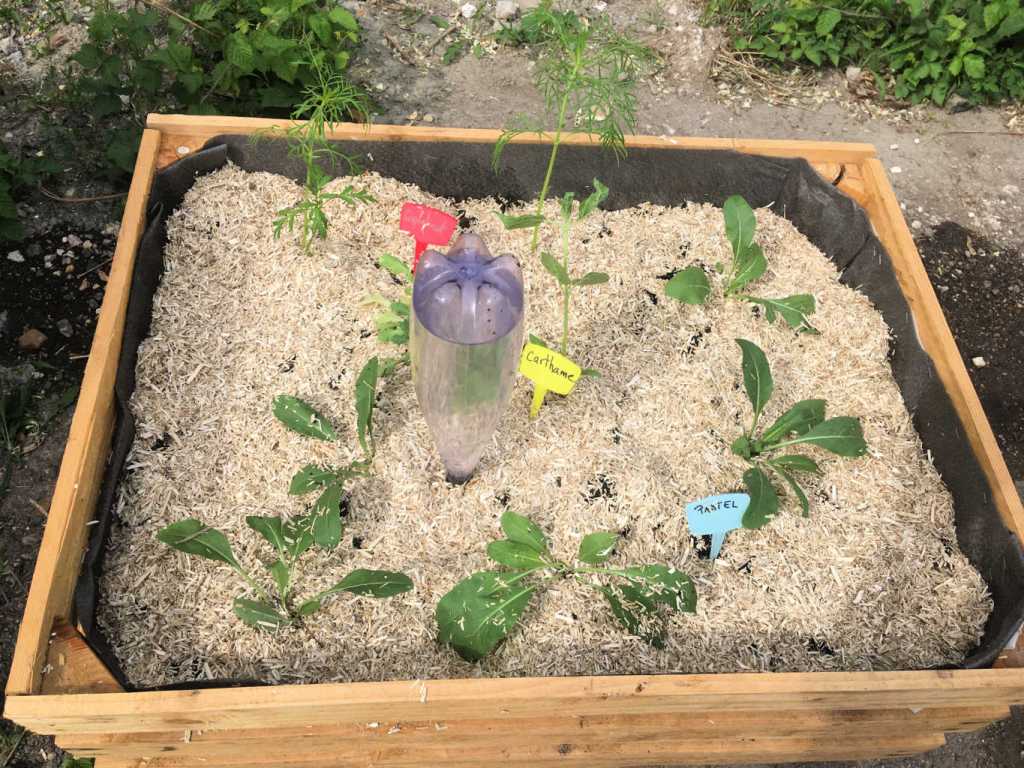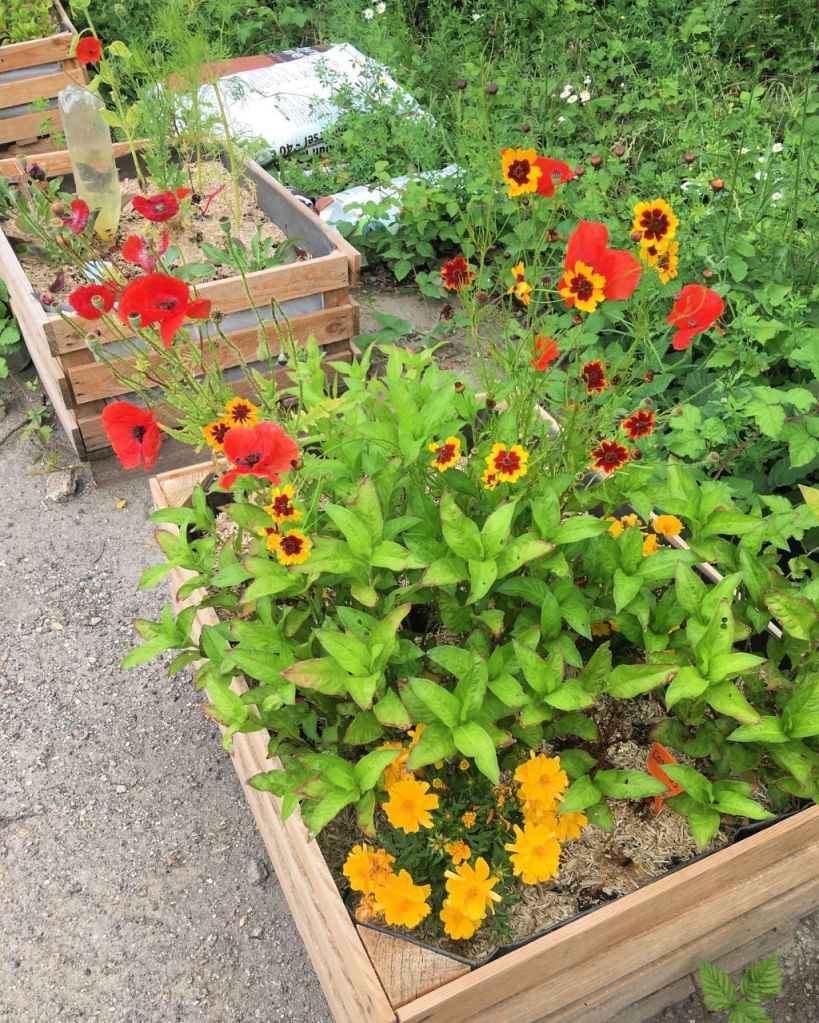 Les plants chouchoutés en serre par l’Autre Champ et le personnel des Serres Municipales ont bien grandi. Nous avons donc prévu 2 séances de construction et de jardinage au jardin Nyéléni : nous avons planté dans le grand bac les jeunes pousses de pastel, cosmos, tournesols, coquelicots, rose trémière, mauve, car ces espèces sont bien adaptés à un sol pauvre. Dans les 6 autres bacs, nous avons ajouté en plus la persicaire à indigo, les coréopsis, bleuets noirs , oeillets d’Inde. Le terreau que nous y avons mis est plus riche que dans le grand bac, nous pourrons ainsi voir quelles plantes s’adaptent le mieux. L’arrosage sera fait par roulement entre Manzambi, service civique de l’association Fun Être sur l’Île, et les membres d’Auberfabrik.