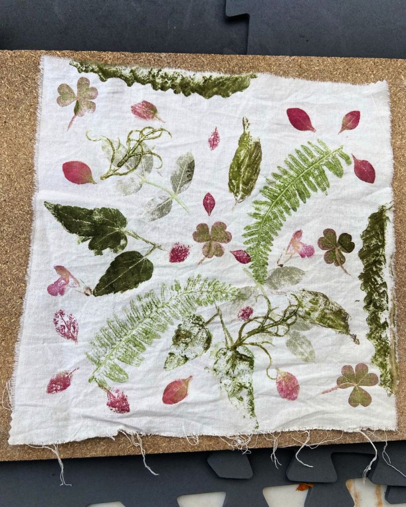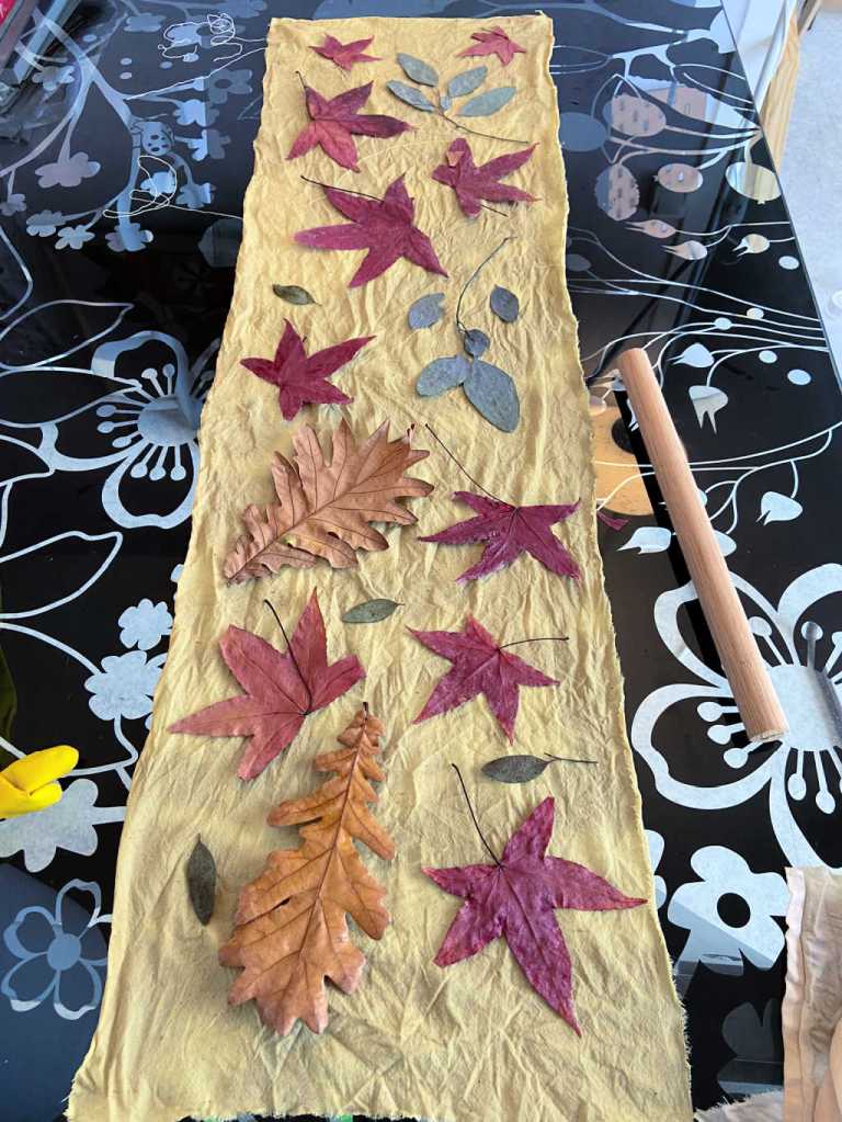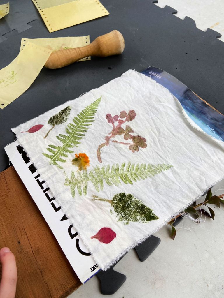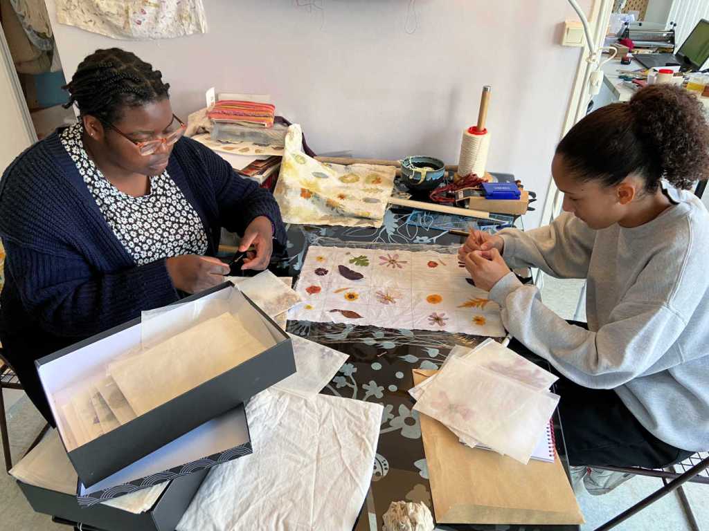 Nous avons travaillé l’écoprint, une autre technique d’impression de végétaux. Les tissus imprimés ont servi à la fabrication d’objets textiles qui seront présentés à la Foire des savoir-faire de Saint-Denis en décembre.