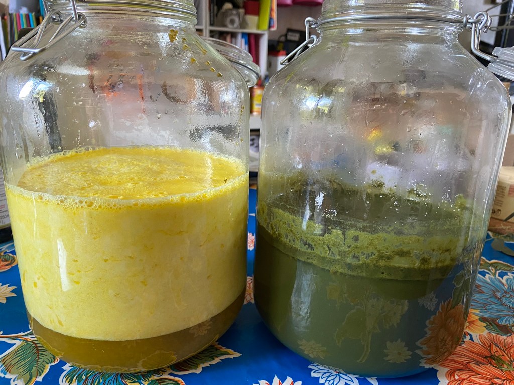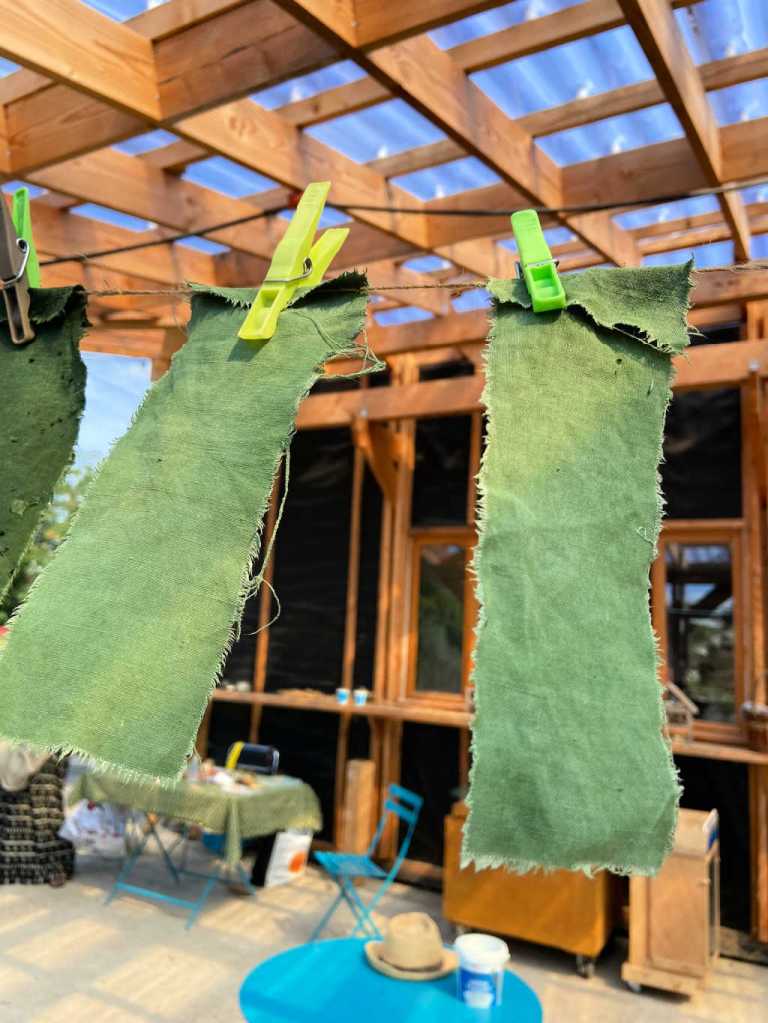 Nous avons fait la rentrée au jardin des Couleurs avec Fun Être sur l’Île. Malgré les arrosages réguliers, la persicaire à indigo a bien souffert mais les autres plantes ont tenu bon. Nous avons récolté des feuilles de pastels pour en extraire une belle couleur verte, et nous avons teint quelques fanions .