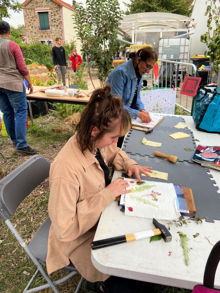 Pour remercier l’association l’Autre champ, qui s’était occupée de nos semis au printemps, nous avons proposé notre 2ème participation au festival Plein Champ avec un atelier de tataki zome (impression par martelage de végétaux). Cela a été l’occasion de promouvoir une autre application à base de plantes récoltées localement.
