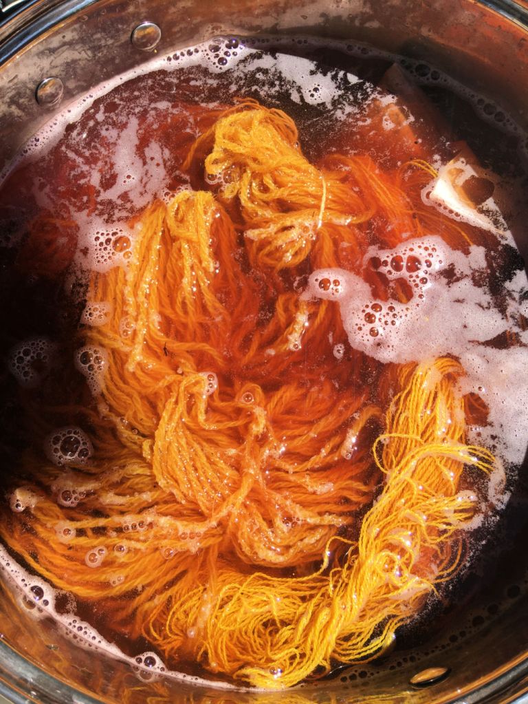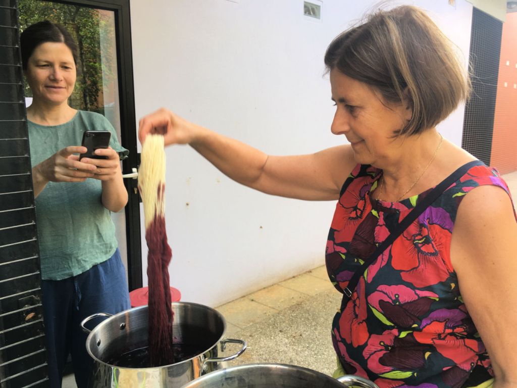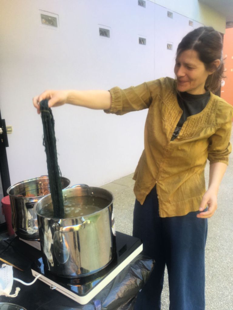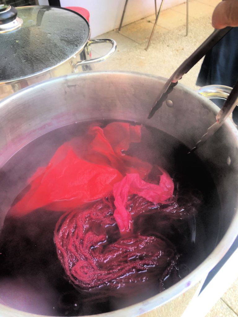 Parallèllement, les séances de teintures végétales continuent au Transfo, à St Denis. Chaque mercredi matin, nous mordançons, teignons des fils et des tissus. Les couleurs sont répertoriées dans le journal de teinture des participantes et les écheveaux de laine teints seront utilisés dans nos ateliers de tissage et lors des démonstrations publiques.