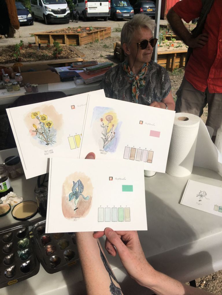 L’association L’Autre champ a été notre premier partenaire. Nous leur avons demandé d’accueillir nos futurs semis dans leur serre. En retour, nous avons proposé de participer à leur festival Plein Champ avec un atelier de découverte des encres végétales . Nous avons pu ainsi présenter au public le projet de Jardin des couleurs.
