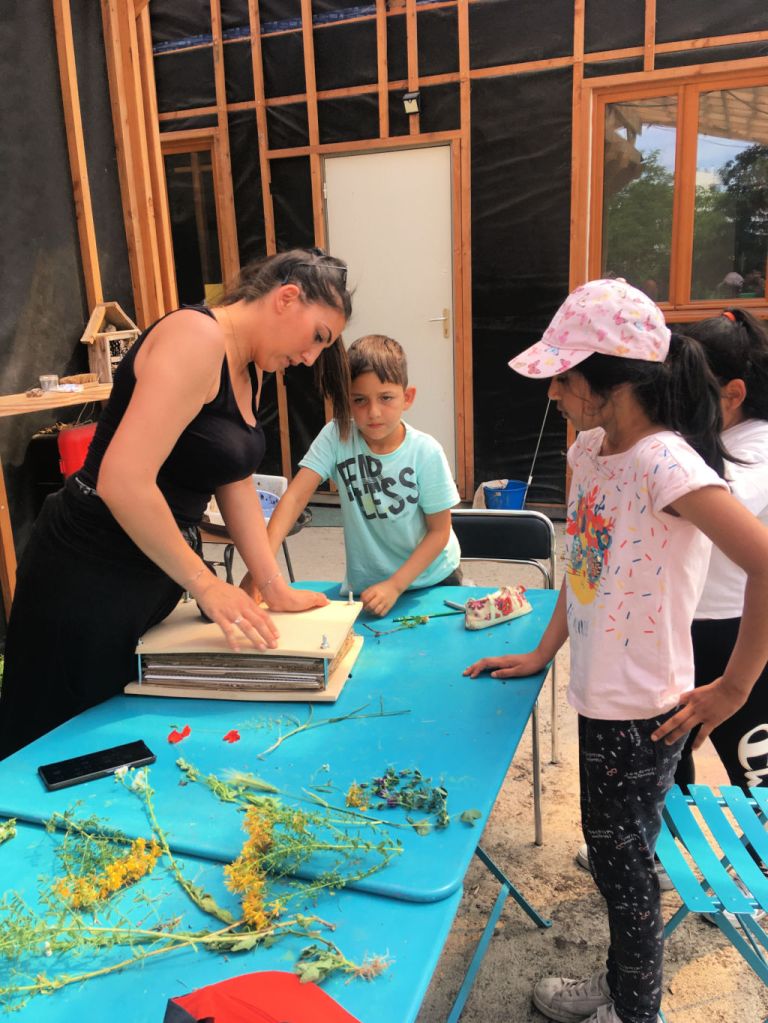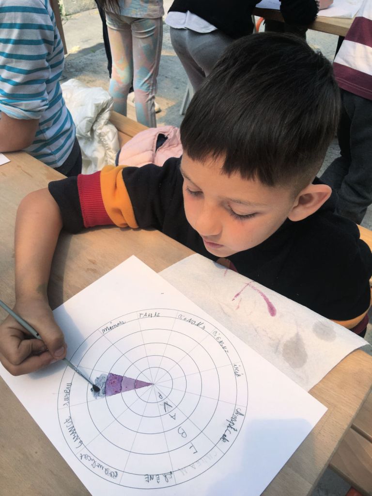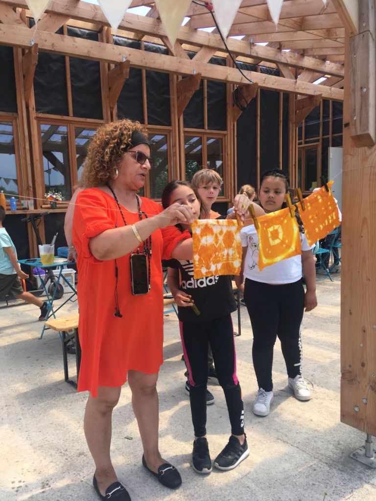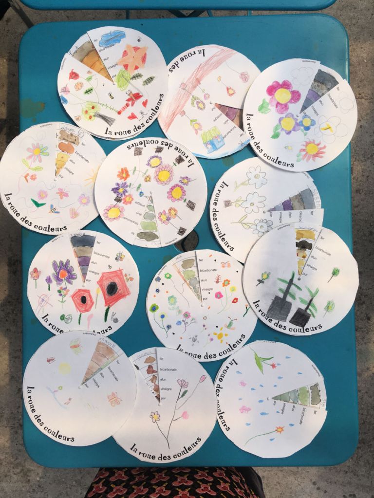 Nous avons accueilli pendant 2 journées complètes la classe de CE1 de Mme Haye, de l’école Georges Martin à Epinay: nous leur avons proposé 1 atelier de découverte des encres végétales, 1 atelier d’expérimentation textile (shibori et teinture) et 2 séances de jardinage . Il faisait très chaud, les enfants ont arrosé avec plaisir nos plantes qui ont bien poussé. L’atelier d’encres végétales a servi à remplir la roue des couleurs, un nuancier qui fera partie de la boîte à outils du jardin. Pour la teinture shibori (teinture par réserve), les enfants ont passé la matinée à préparer leur tissu, en le cousant, nouant, pinçant. Après un pique-nique au jardin, ils ont pu teindre leurs échantillons dans un bain de curcuma.