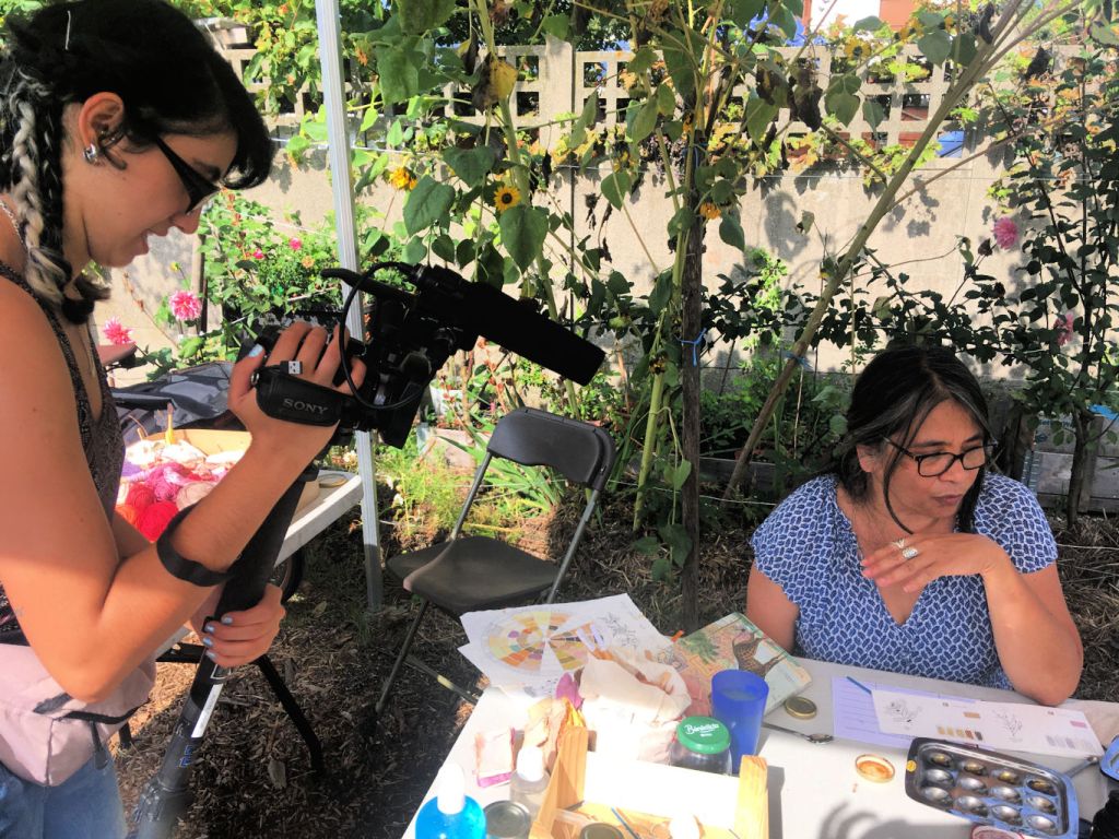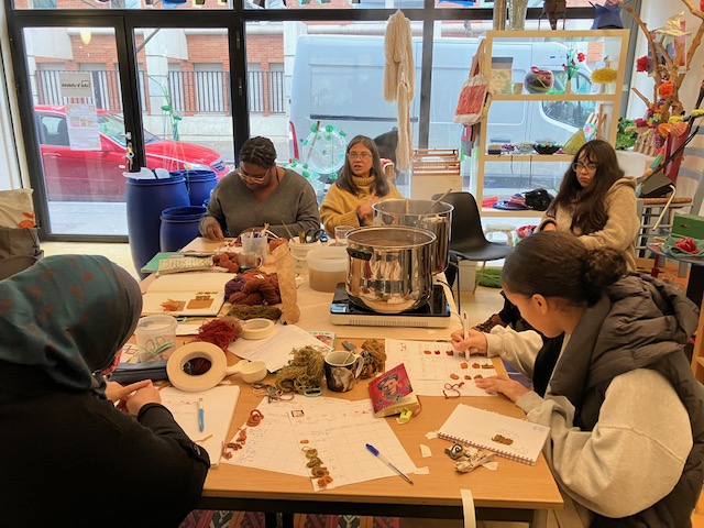 Nous avons contacté un nouveau partenaire, l’association Déchets d’arts, afin de proposer des séances de teintures végétales et autres expérimentations textiles dans leur local le Transfo, situé à Saint-Denis. Le processus de teinture étant long, il nous fallait un endroit avec électricité et où nous pouvions laisser le matériel et les décoctions sur place. cela n’était pas possible au jardin Nyéléni. Nous avons pu ainsi toucher d’autres publics, de Saint-Denis, Aubervilliers qui sont venus découvrir les couleurs des plantes. Au cours de ces 9 séances, les participants ont été invités à découvrir les plantes tinctoriales, et à créér des nuanciers. Nous avons abordé les différentes étapes du processus de teinture, de l’extraction des colorants à partir des plantes, de la préparation des fibres pour la teinture aux différentes applications possibles (teinture de fils et de tissus, shibori, création d’un nuancier de couleurs…). Ces séances ont été une sorte de laboratoire, chaque expérimentation étant notée pour alimenter la future boîte à outils du Jardin des Couleurs.