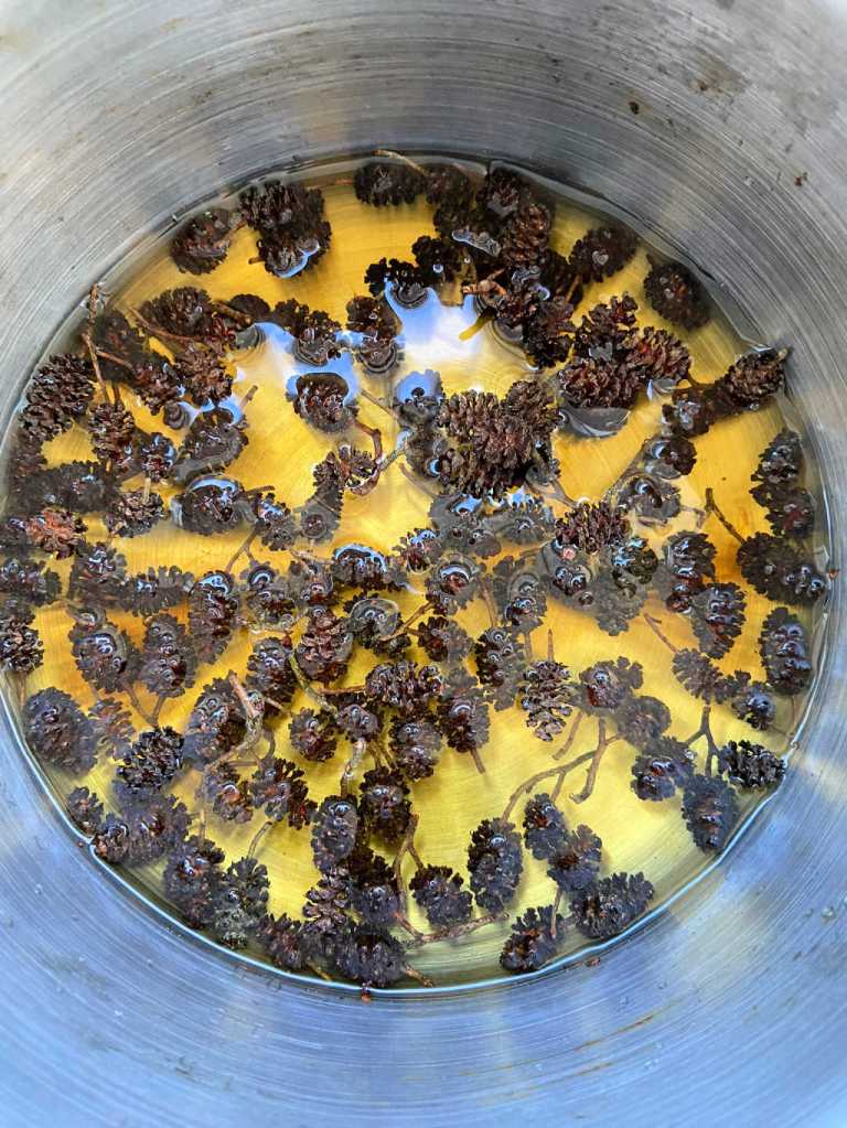 Au jardin, c’est presque la fin des fleurs, seuls les coréopsis et les oeillets d’Inde éclairent les bacs de leurs jaunes orangés. L’indigo commence à peine à fleurir, promesse de quelques graines pour le printemps prochain. Les pastels continuent à se développer à profusion, on récolte des feuilles au fur et à mesure . Autour du jardin, on repère les millepertuis et les arbres dont les feuilles serviront à tester l’ecoprint. C’est l’époque des glands de chêne et des chatons d’aulne, 2 plantes à tanins, leur récolte servira à fabriquer des pigments que nous utiliserons lors de nos ateliers de découverte des encres végétales.
